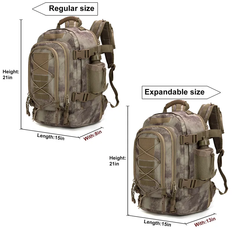 【Large Capacity Tactical Backpack and Multi Compartments Military Backpack】Regular Size: 14.5”x 21”x 8”. Expandable Size: 14.5”x 21”x 13”. Main compartment expands from 39L (2380 cu in ) to 64L (3905 cu in). This school backpack has 4 main loading spaces and water bottle mesh pocket. Plenty of rooms for a lot of stuff and plenty of separate compartments you have organized.